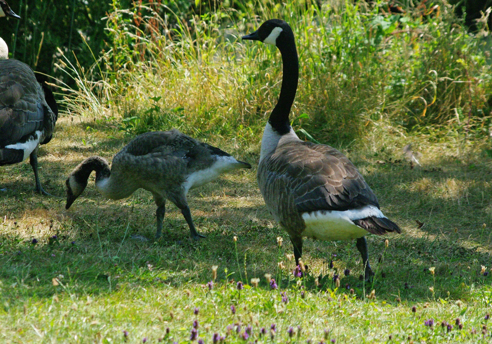 Bernachou (à droite) est toujours là! Bientôt on ne le distinguera plus de ses parents ou congénères!Va-t-il s'envoler, avec son petit groupe, vers d'autres horizons bientôt, ou restera-t-il fidèle au lieu de sa naissance?