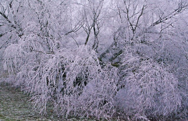 Un peu moins de brouillard aujourd'hui... Nous avons fait le tour d'un parc transformé par le givre.