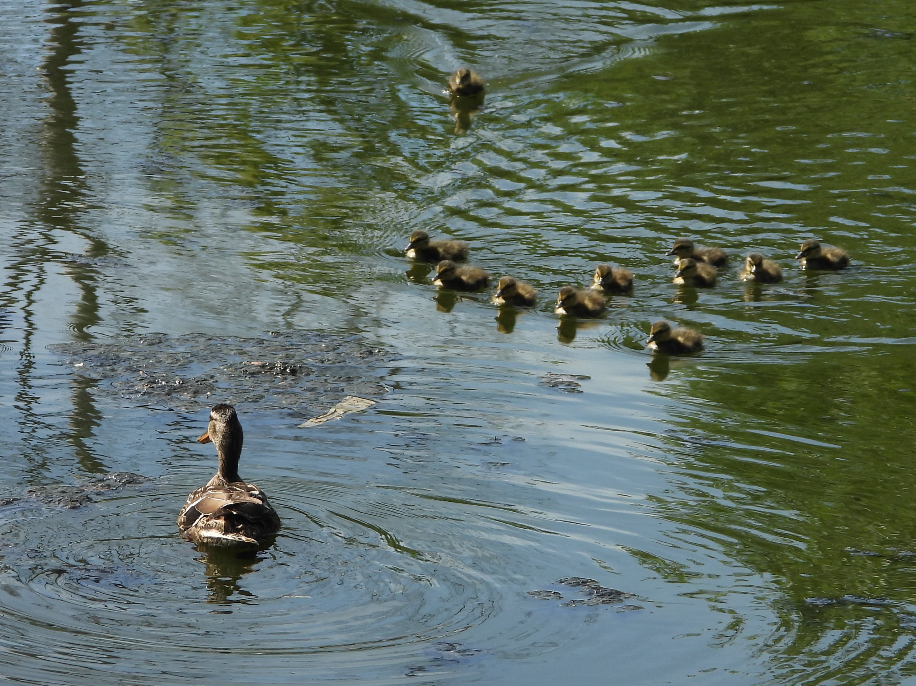 C'est une famille nombreuse qui apparaît sur le bras ouest de l'étang ce jour : une couvée de 11 canetons ! A peu près au même endroit que la couvée de 11 de l'an dernier.