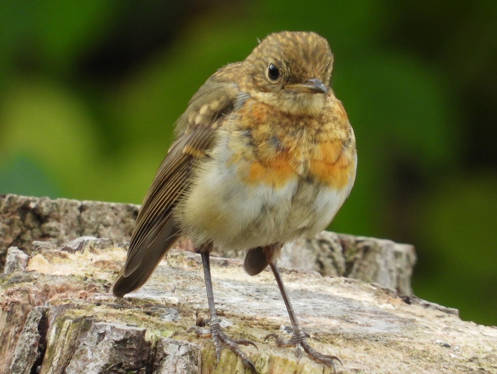 Rouge gorge juvénile : la zone où se constituera le jabot orange apparaît déjà.